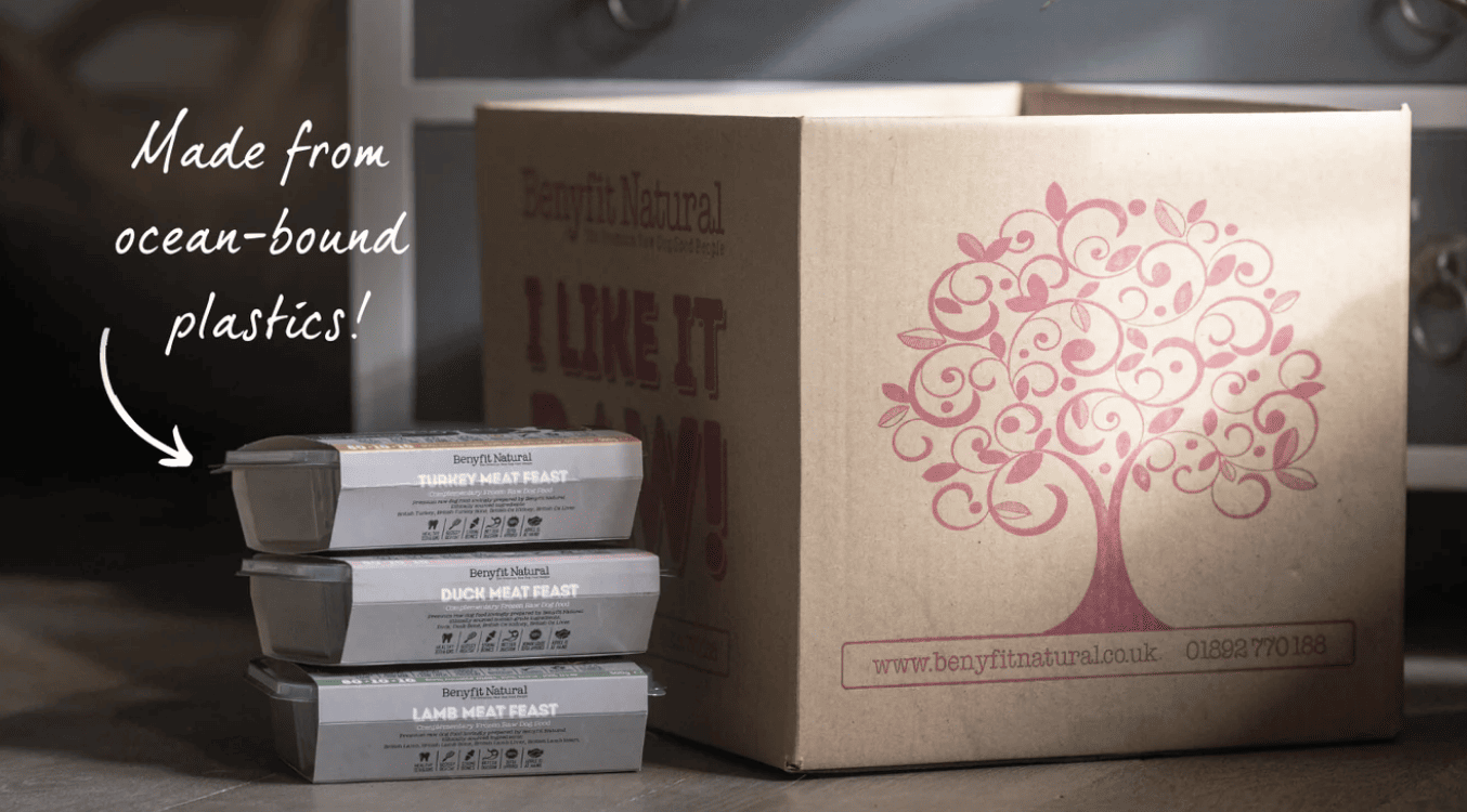 In their own words, “We looked at all options when it comes to packaging our delicious raw dog food recipes and we’ve not found a solution that works quite as well as plastic. Perfect for neatly stacking and saving space plus plastic keeps your dog food fresher for longer. We’ve worked with the team at Prevented Ocean Plastic to create a tub made from recycled plastic collected from coastlines across the globe, that would have otherwise polluted our oceans.”